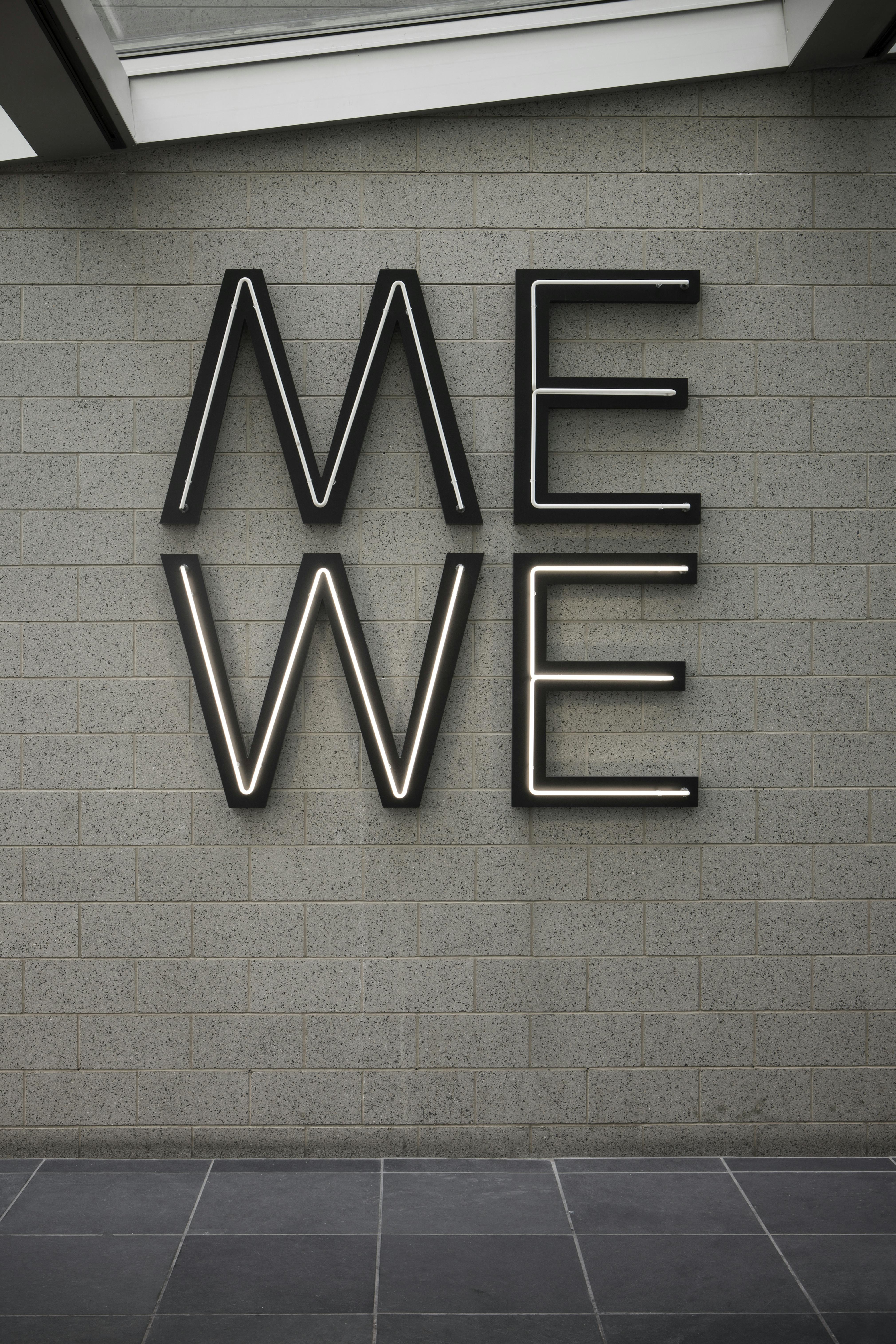 Text-based works can invite multiple readings and inspire new ways of considering legibility. Artist Glenn Ligon plays with the deceptively simple uses of language in his neon work Give Us A Poem (2007). Ligon is best known for his practice of citing literary references and exploring their presentation in black-and-white across painting, drawing, sculpture, and installation. In this work, the artist references a lecture given by Muhammad Ali at Harvard University in 1975. When asked by a student to give the audience a poem, Ali responded succinctly with the words “Me We.” Here, the poem and its powerful invocation of the individual and the collective shines brightly.
