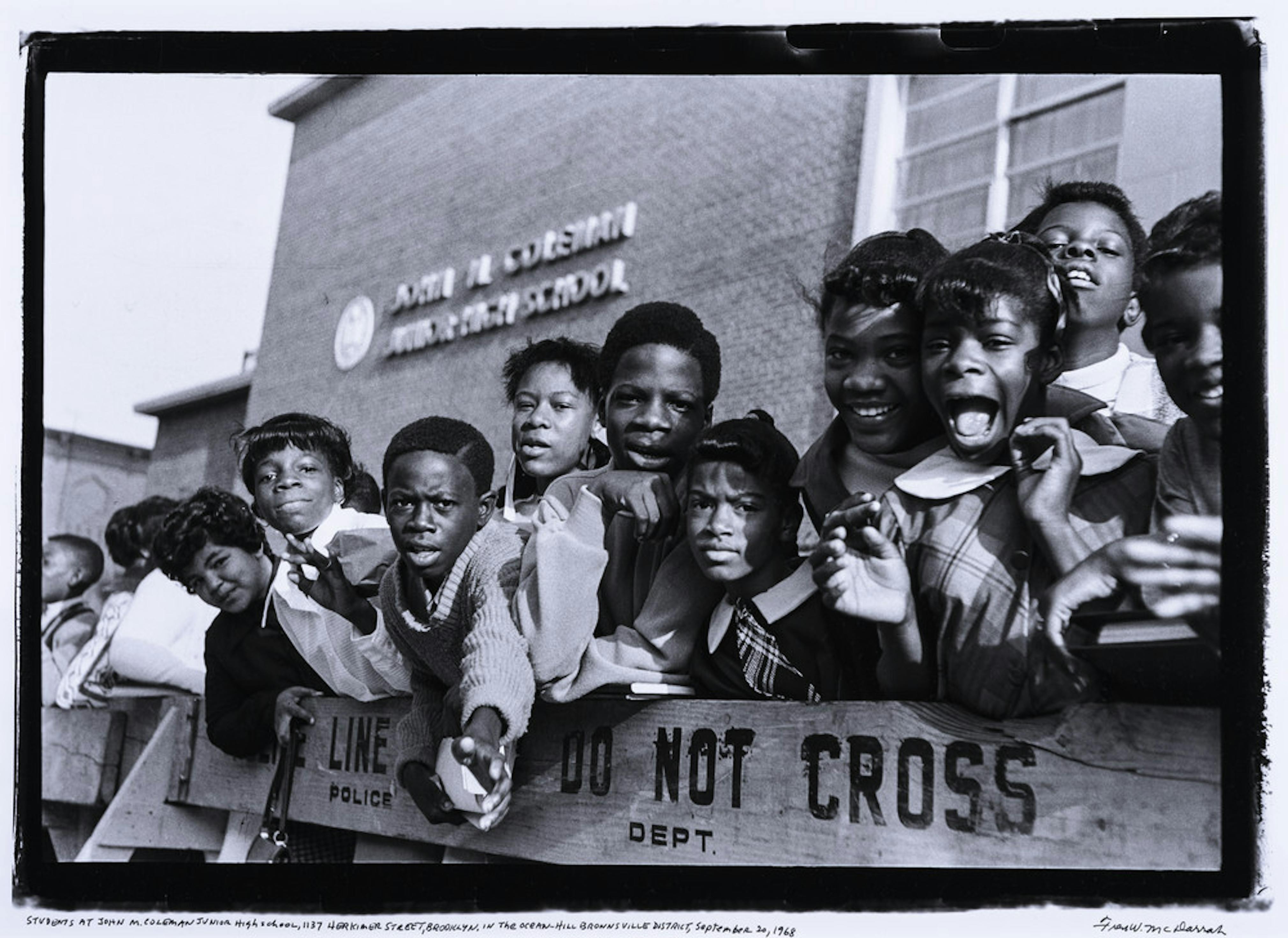 Taken in front of John M. Coleman Junior High School 271 in Ocean Hill–Brownsville, Brooklyn, this photograph acknowledges the power of the education system and the responsibility of schools to reflect the communities they serve. By 1965 the majority of public-school students in Ocean Hill–Brownsville were Black or Latinx, while two-thirds of their teachers were white. In response to this disparity in representation, a new community-controlled school system was implemented in 1967. The Teachers Union, viewing Black and Latinx community control as a threat to teacher job security, launched a strike the following year. In this photograph, photojournalist Fred McDarrah captures students standing along the police barriers during the strike.