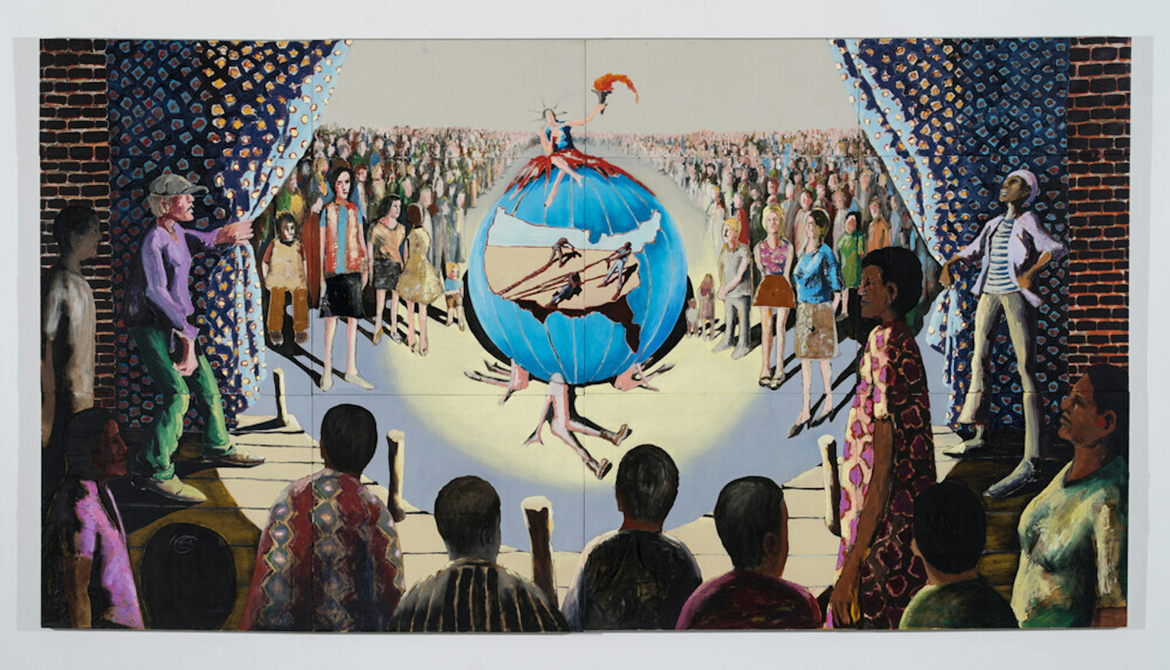 At the center of this work, a young blonde woman in an American flag dress holds a torch as she sits atop a globe, where three Black men are depicted laboriously pulling an unseen object across the United States. The woman is Lady Liberty, but she does not bring freedom to all citizens. This painting, a study for a larger work titled Trash, is part of “The Bicentennial Series” (1970–76), in which Benny Andrews accurately predicted the exclusion of African-American history and culture from the 1976 U.S. bicentennial celebrations.