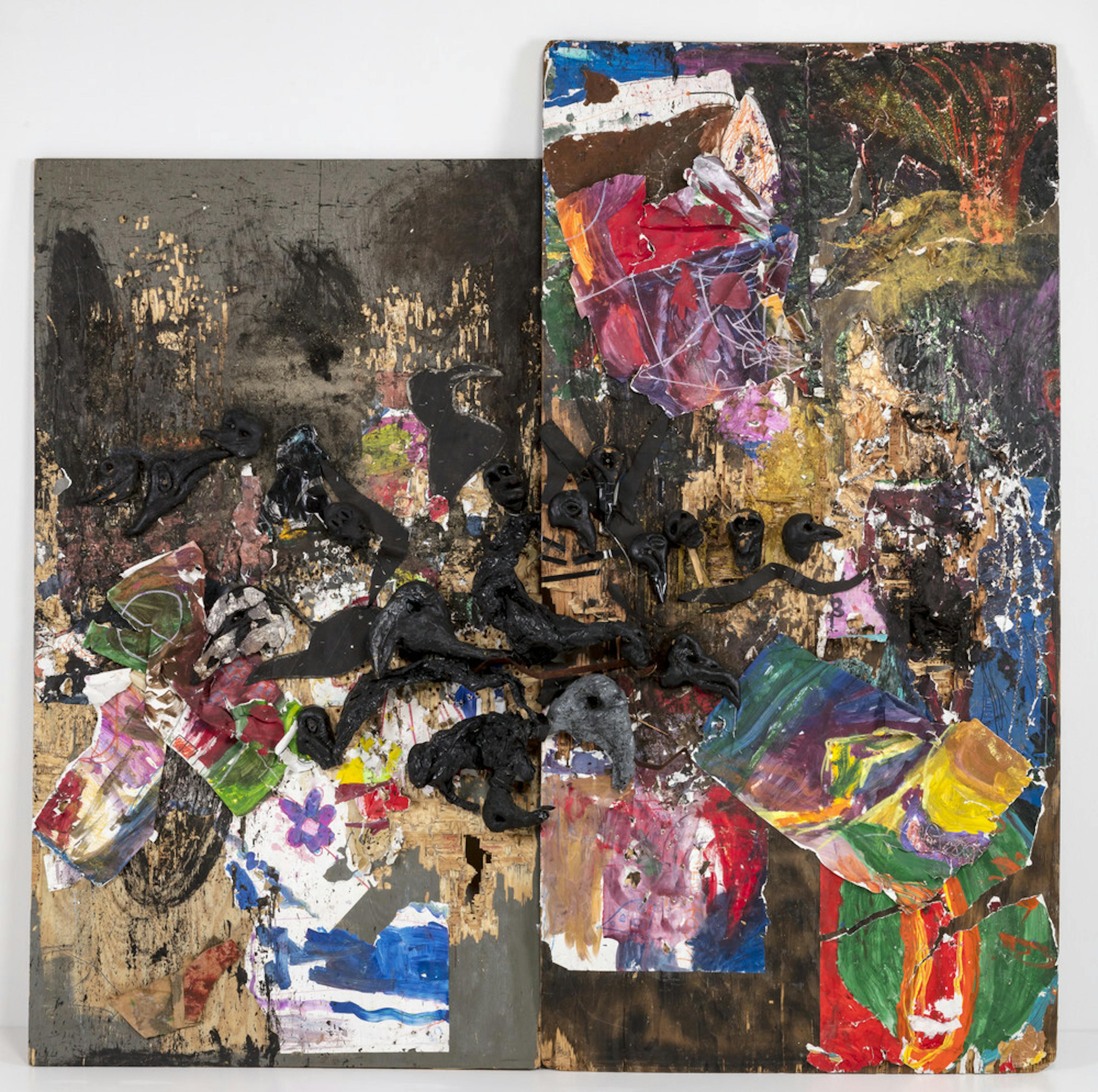 Found wood panels, latex enamel, tempera, paper pulp, paper, and tape