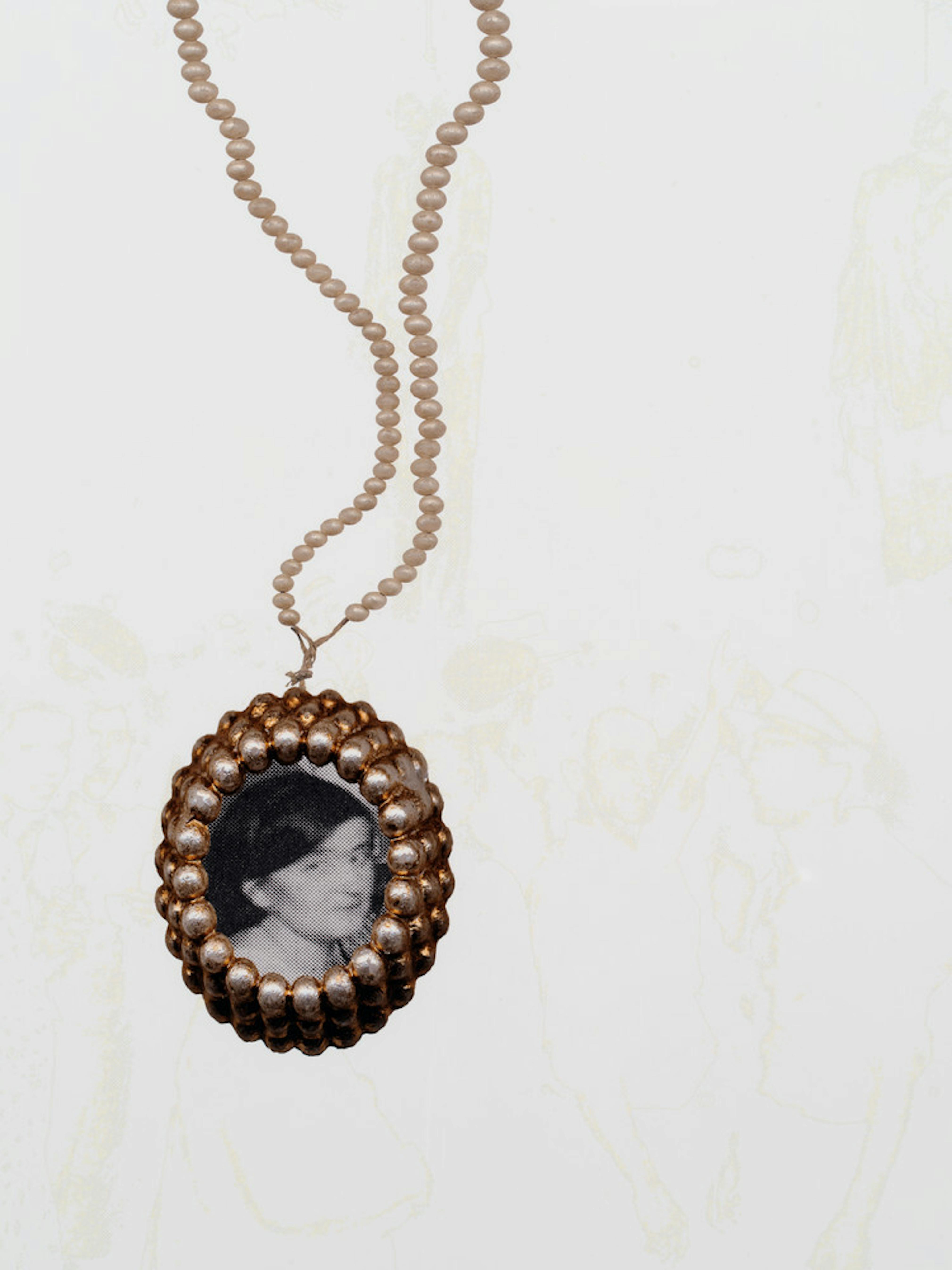 Heirlooms & Accessories makes use of Lawrence Beitler’s 1930 photograph of the murders of Thomas Shipp and Abram Smith to interrogate the legacy of racial violence. Fading the rest of the image so that it nearly matches the white of the paper, Kerry James Marshall highlights the faces of three women in the crowd, accessories to the murders, and places each of them inside a locket, an accessory. These three women, each representing a different generation, participate in a legacy of racism. This legacy is made tangible by turning them into pieces of jewelry, heirlooms that are physically passed down from generation to generation.