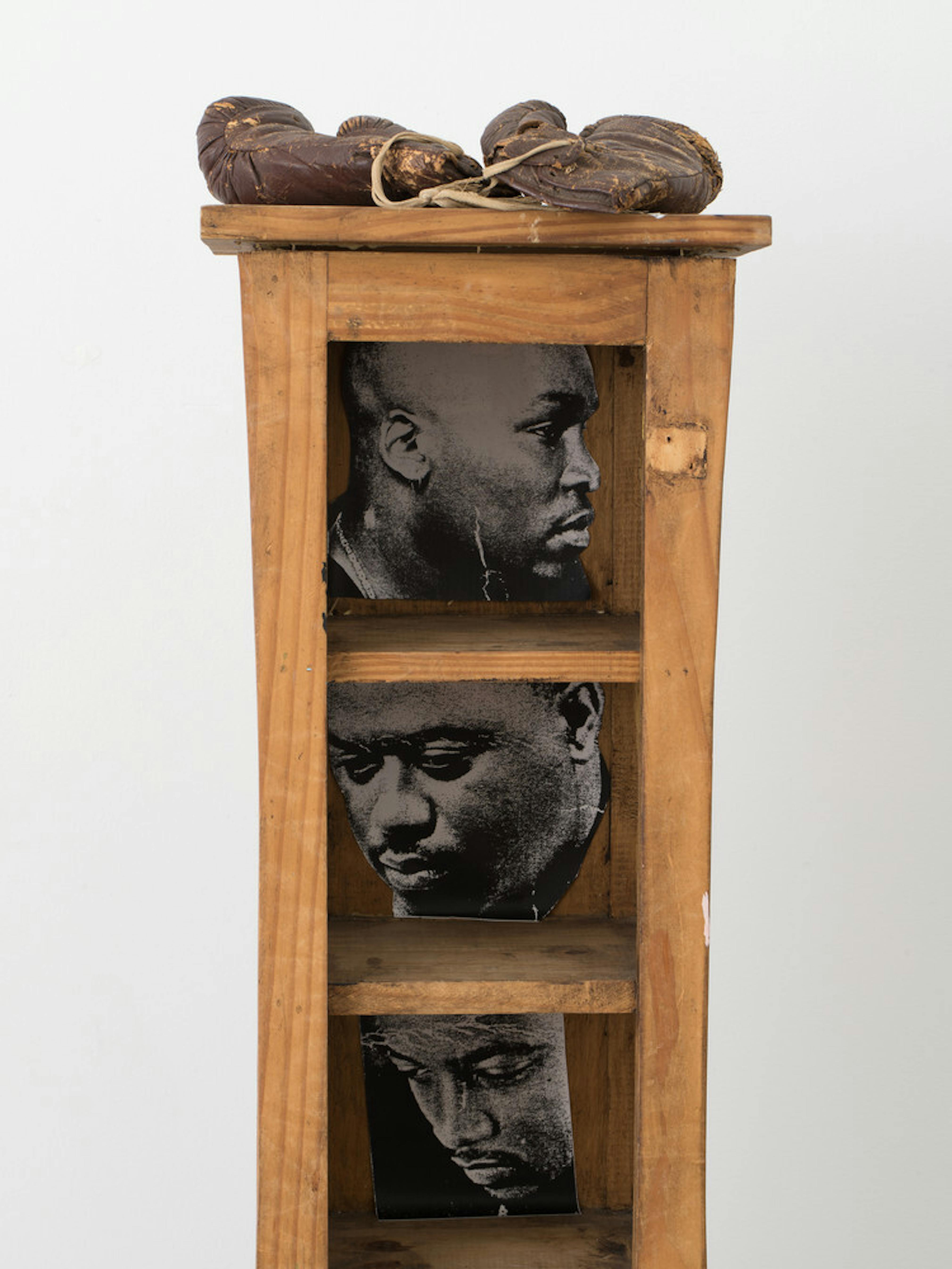 Boxing gloves, lighter, xerox, and wood cabinet