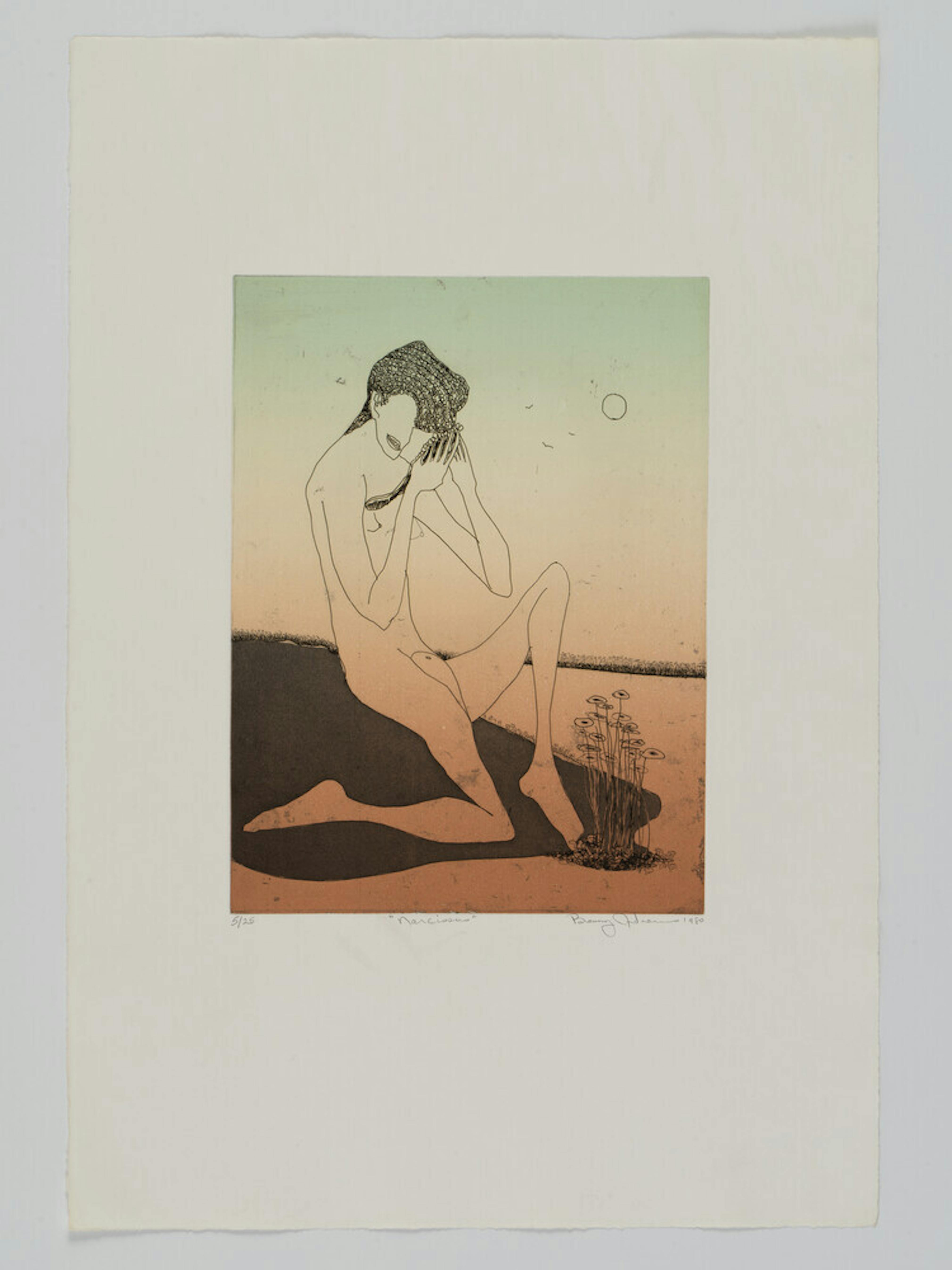 Narrated in Book III of Ovid’s Metamorphoses, the mother of Narcissus solicited advice from the blind seer Tiresias, who told her that her son would live long, provided he never “discovered himself.” Inevitably, Narcissus stumbled across his reflection, fell in love, and succumbed to the pain of unrequited (self) love. In his visual interpretation of the myth, Andrews off-centers the figure of Narcissus, who strokes his tightly curled hair, and emphasizes the figure’s delicate limbs through a fine etching technique. At the edge of a dark pond grows a small patch of daffodils—the flower into which Narcissus was reborn. Here, Andrews depicts a moment of self-realization, and hints at an impending absorption with the self into unity with others and nature.