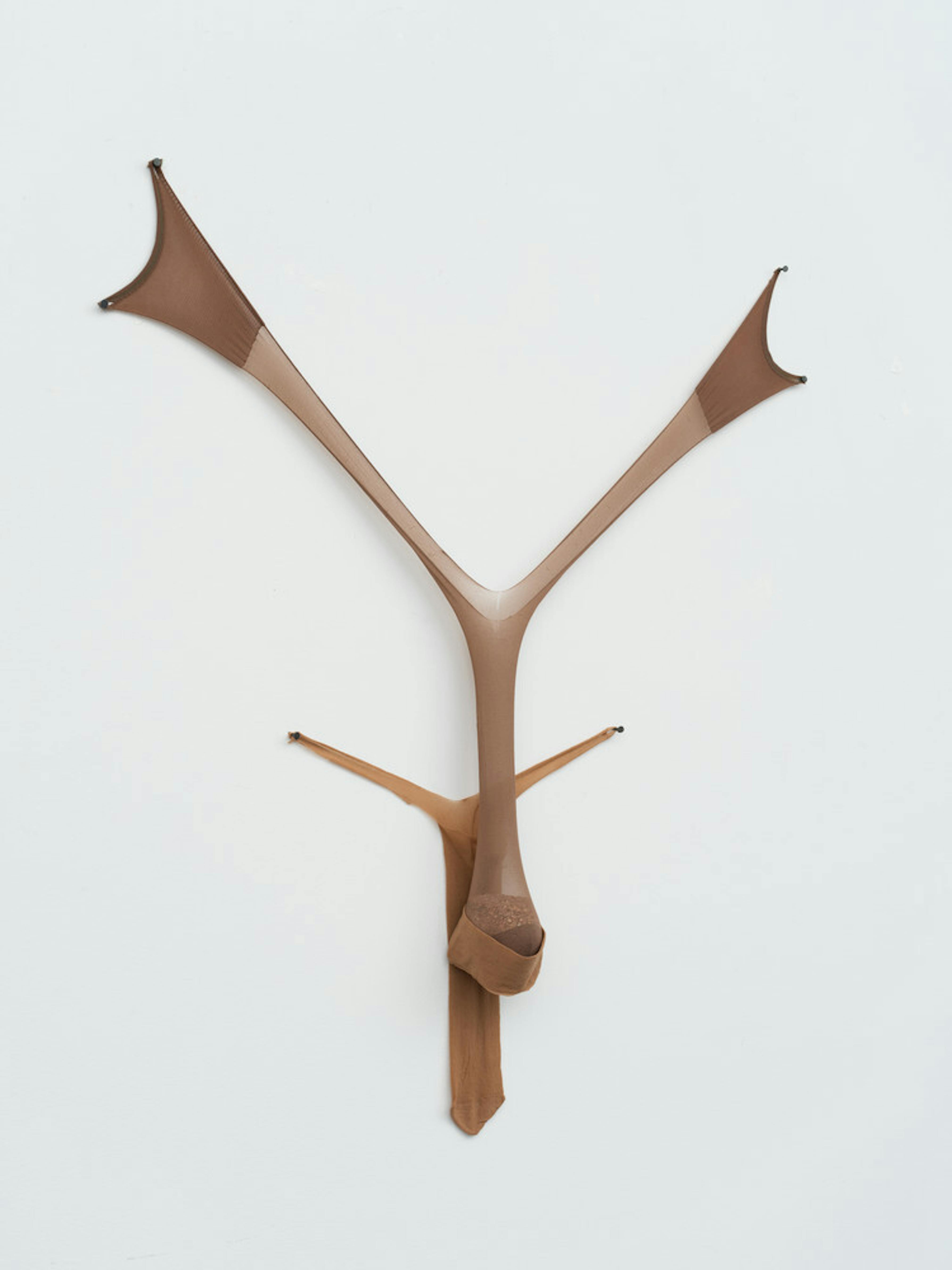 Through sculptures composed of flesh-toned pantyhose, Senga Nengudi taps into the symbolic potential of fiber materials. Since the 1970s, Nengudi has produced works, such as R.S.V.P. V, using brown pantyhose. In stretching the tights into elongated linear forms, she gestures toward the movement and resistance of Black women as they navigate society’s historical gender roles. The work is part of her "R.S.V.P." series of sculptures and performances, whose title is an abbreviation of the French phrase répondez s'il vous plaît (meaning “please respond”), alluding to performances during which dancers enter and lean into the sculptures. In both action and stillness, Nengudi’s works demonstrate the tensile resilience of the material and, symbolically, of Black women.