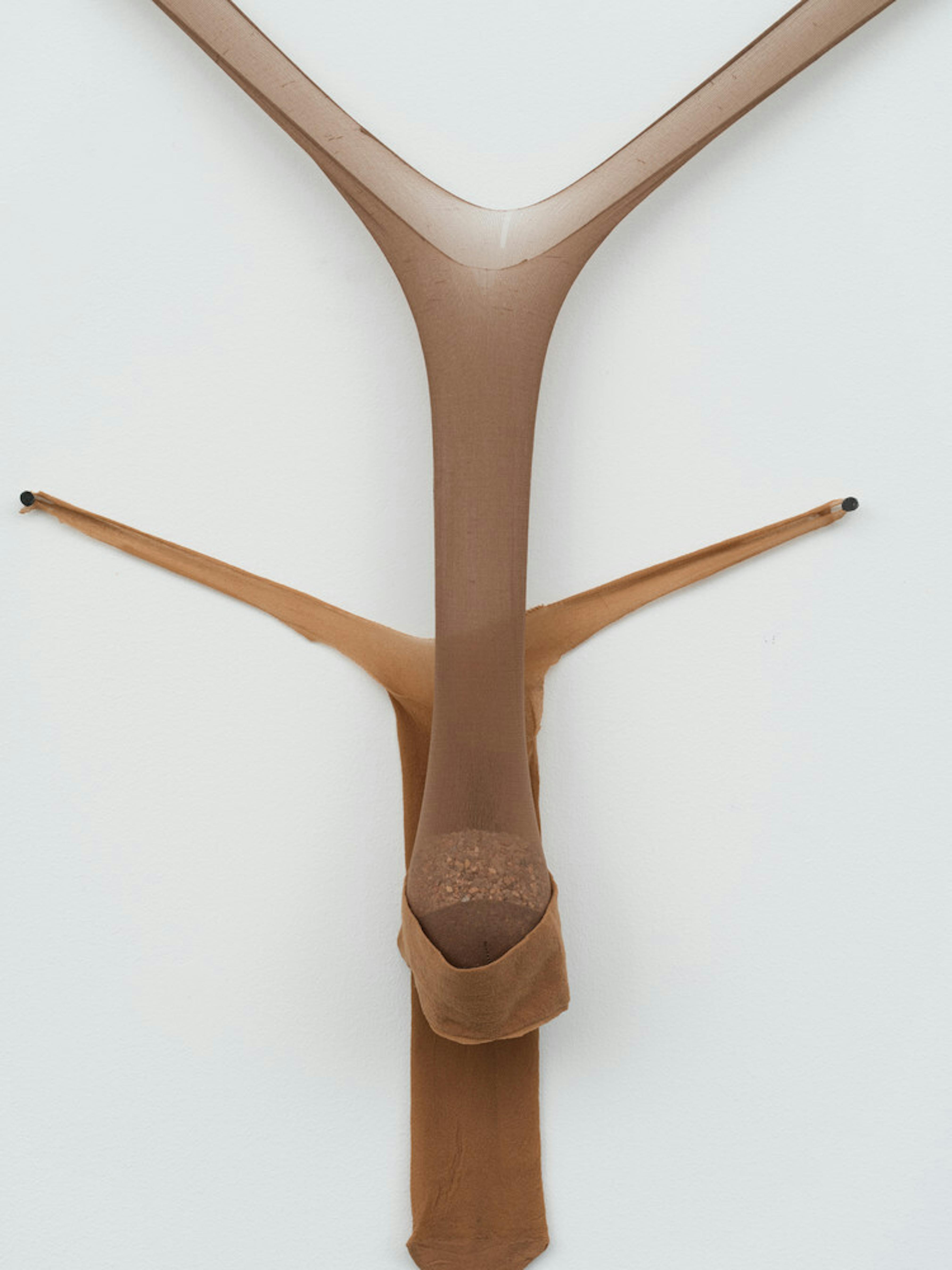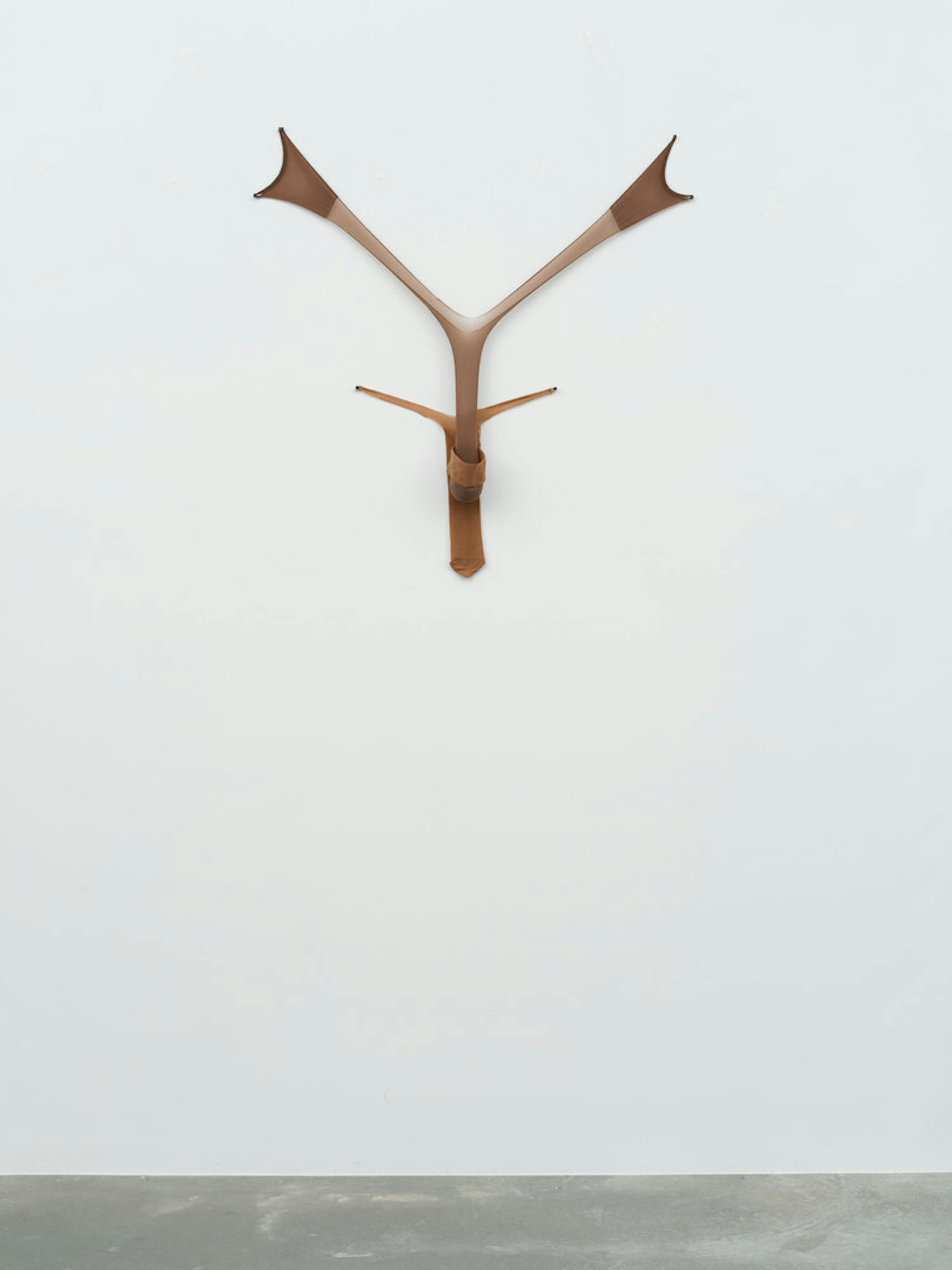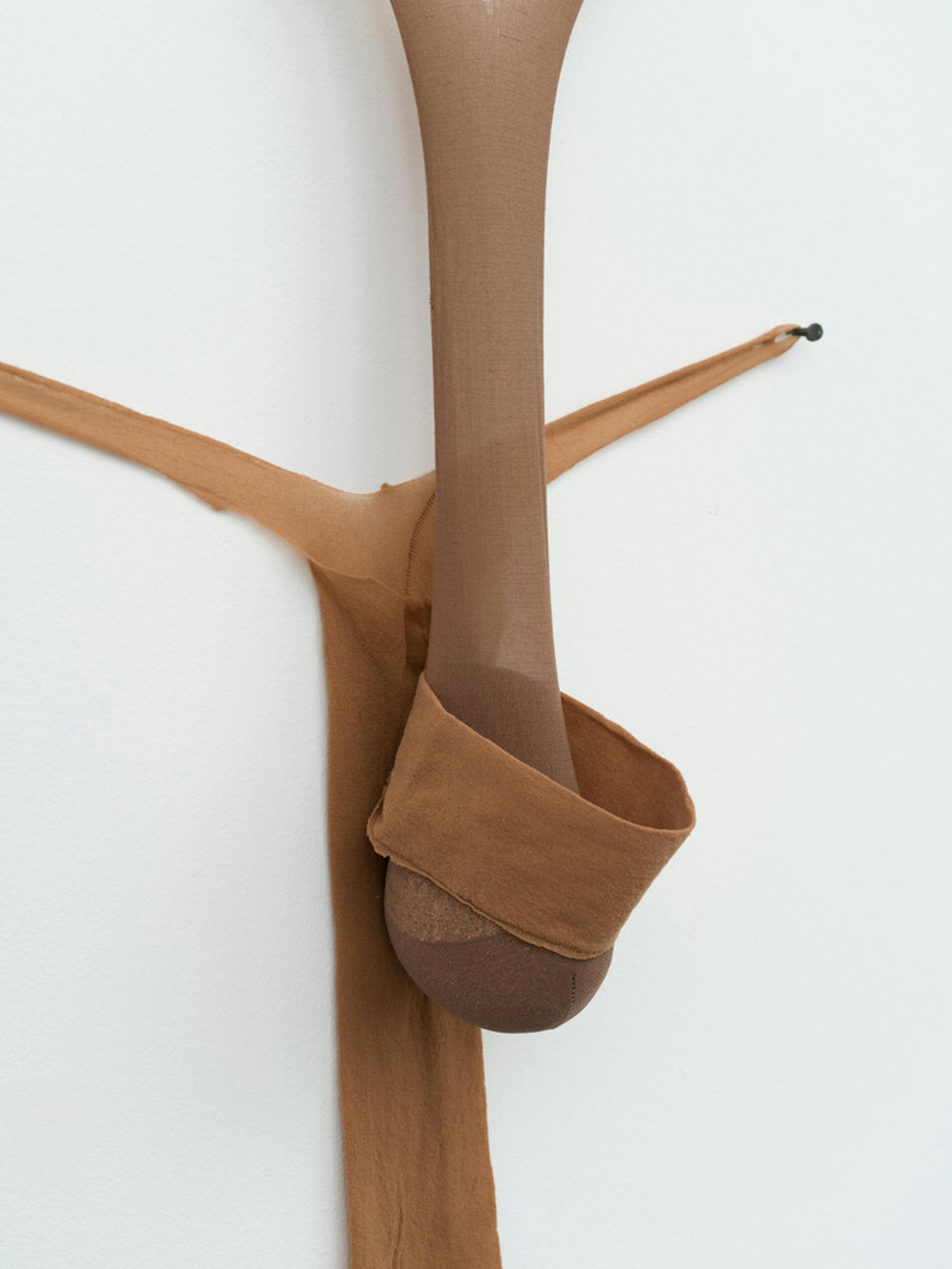 Through sculptures composed of flesh-toned pantyhose, Senga Nengudi taps into the symbolic potential of fiber materials. Since the 1970s, Nengudi has produced works, such as R.S.V.P. V, using brown pantyhose. In stretching the tights into elongated linear forms, she gestures toward the movement and resistance of Black women as they navigate society’s historical gender roles. The work is part of her "R.S.V.P." series of sculptures and performances, whose title is an abbreviation of the French phrase répondez s'il vous plaît (meaning “please respond”), alluding to performances during which dancers enter and lean into the sculptures. In both action and stillness, Nengudi’s works demonstrate the tensile resilience of the material and, symbolically, of Black women.