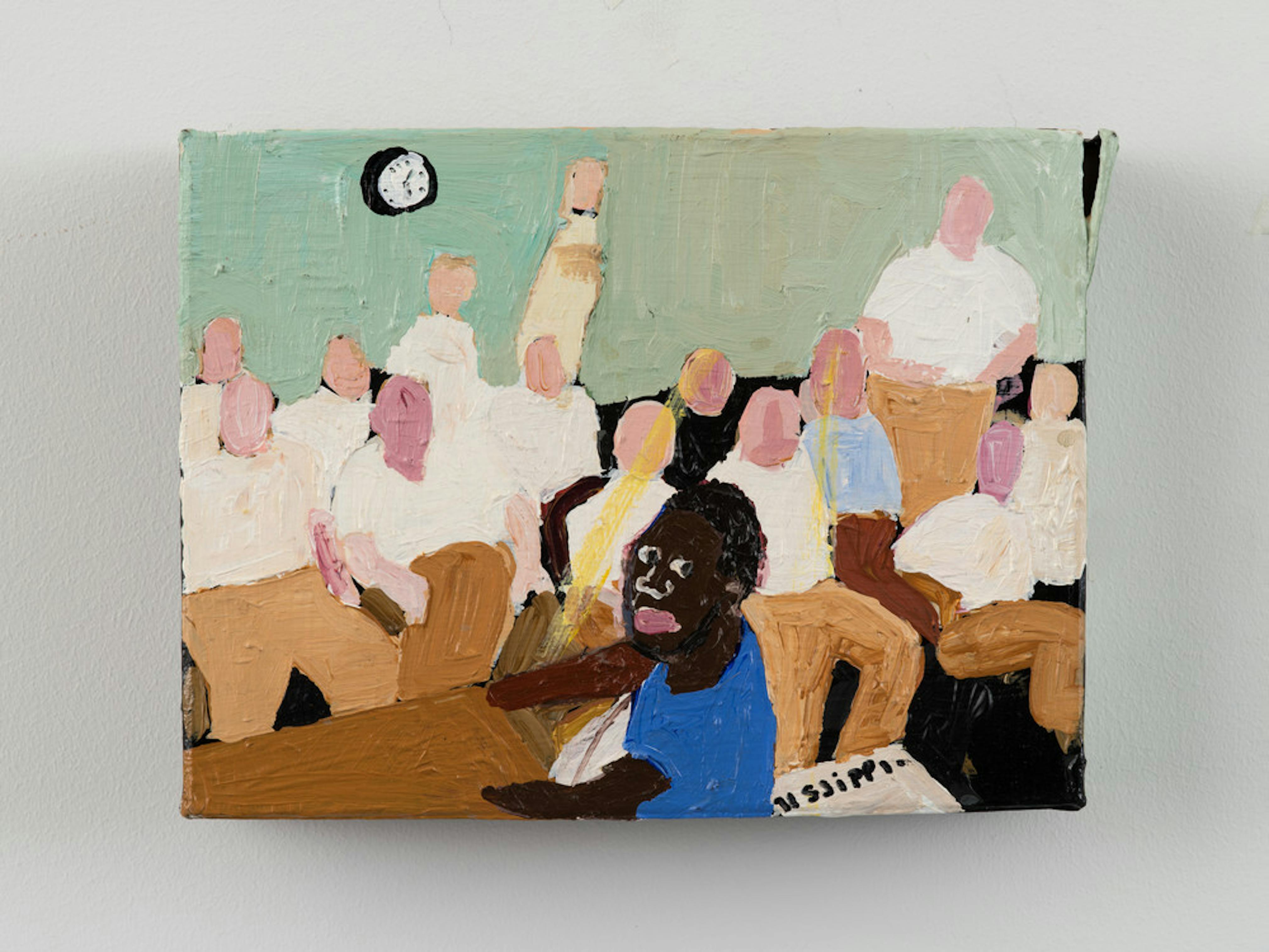 Against the white shirts, khaki pants, and blank faces of the jury, the foregrounded Black man wearing a bright blue shirt appears in stark contrast. While the white jurors show no facial features, the defendant’s eyes open wide as he turns to face the viewer. Taylor uses this visual dissonance to explore experiences of a biased criminal justice system. The man’s gaze captures the fear someone might feel while standing trial—a fear compounded in this case by the denial of a fair trial by a jury of one’s peers.