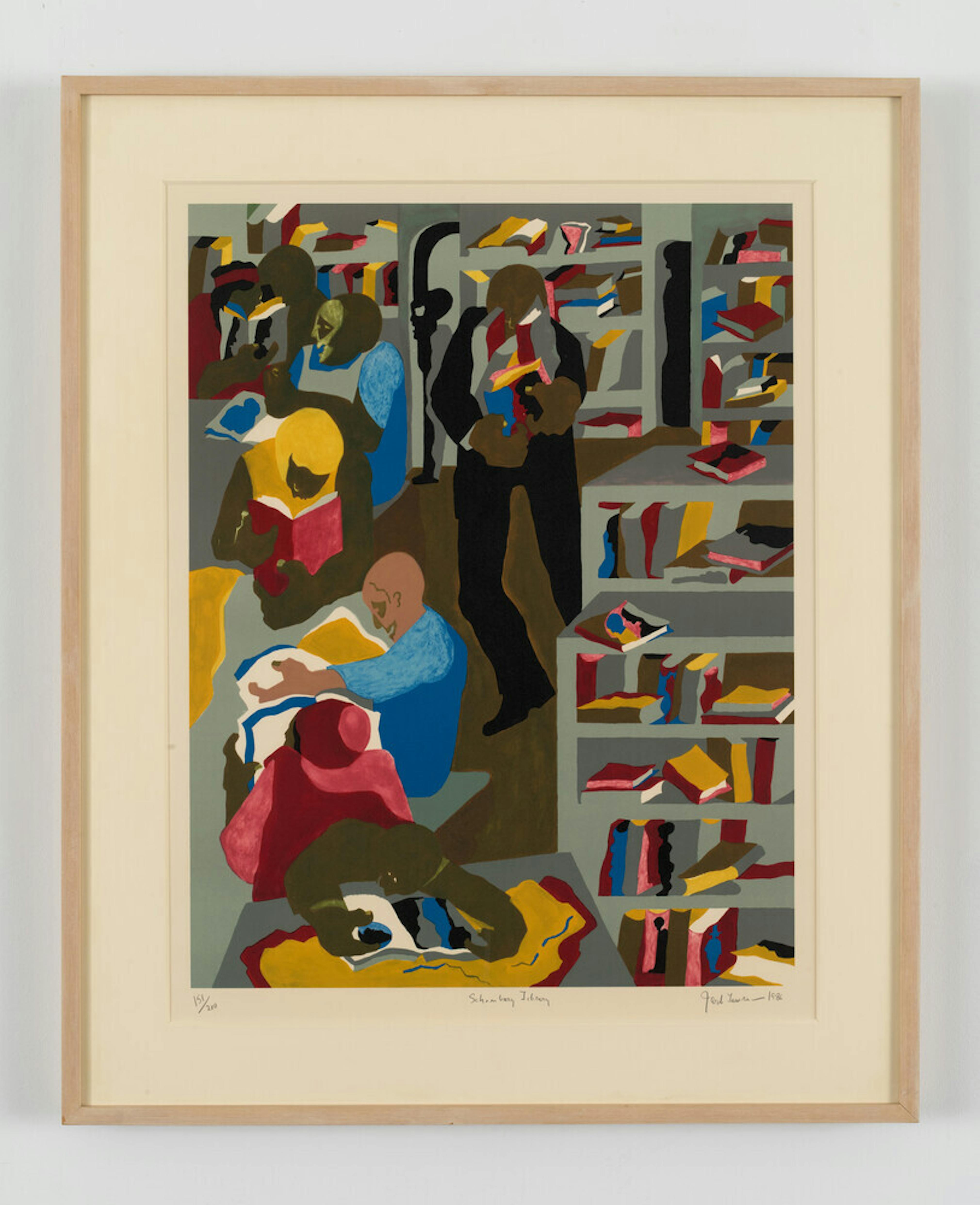 During the years he lived in Harlem, Jacob Lawrence spent a great deal of time at the 135th Street branch of the New York Public Library, what is now the Schomburg Center for Research in Black Culture. There, he took classes as part of the Harlem Art Workshop and conducted research for many of his narrative paintings of historical events and figures. This work on paper, made decades after Lawrence moved from the neighborhood, celebrates the library and its collection. The figures are each engrossed in their reading materials, suggesting the eagerness with which they seek to learn about their history.