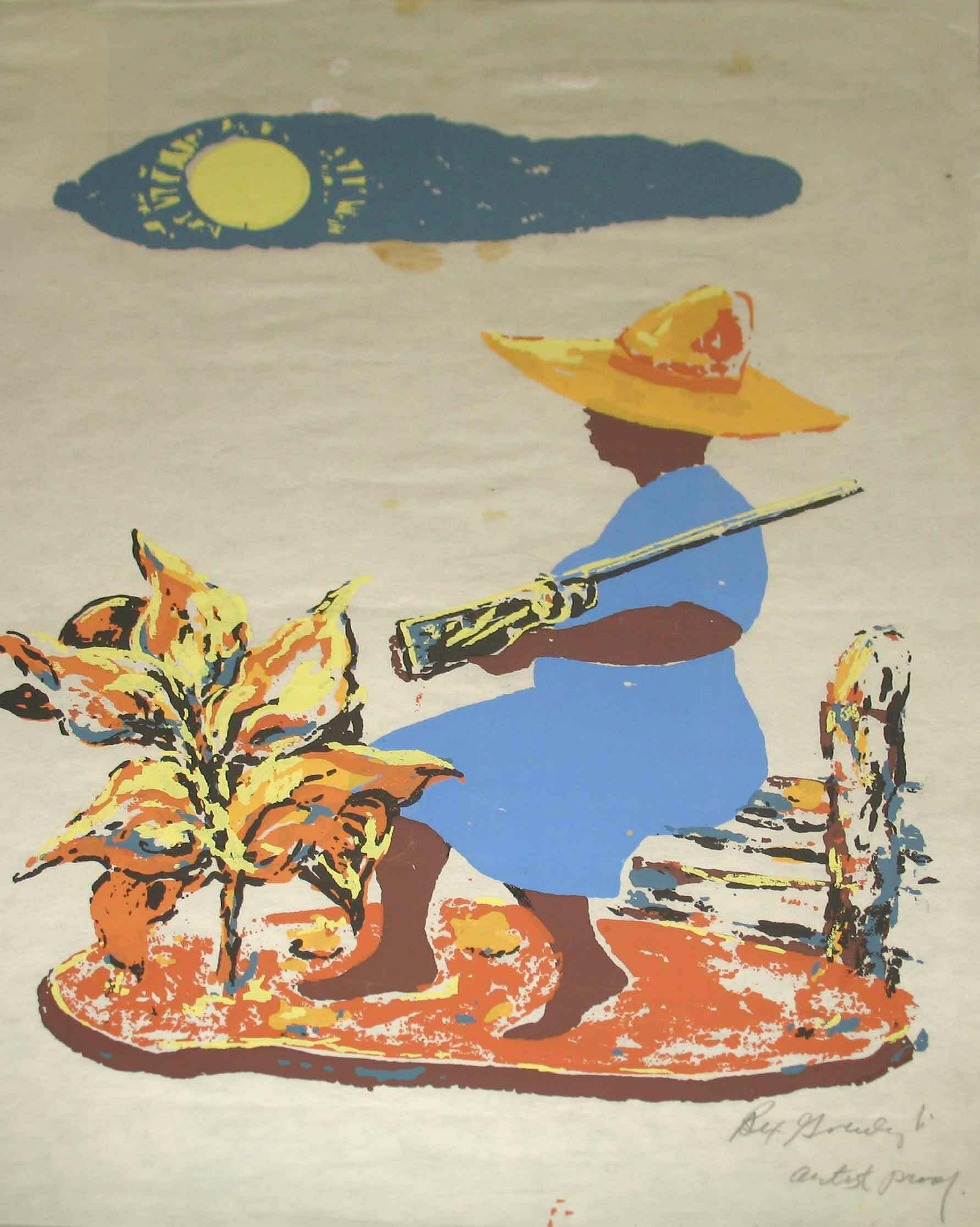 The works in this exhibition explore the themes of labor, love and life in different ways. In Separation (1954), Elizabeth Catlett Mora’s linocut on paper, a woman is depicted behind a barbed-wire fence, staring across to the other side. It is unclear if she has been separated from her friends, family or freedom, but a sense of longing and weariness is evident in her face. On the other hand, Jacob Lawrence’s colorful lithograph, Tools (1977) focuses on the tools of labor instead of the actual laborers. In Sunday Promenade (1935/1985), one of four block prints by Hale Woodruff in this exhibition, men and women in hats of different shapes and sizes leave Sunday church services. For them, the walk home may be a time to catch up with friends, discuss the events of the past week or reflect on the sermon they just heard. The most recent works in this exhibition, two photographs from Barthélémy Toguo’s “Transit” series (1996–1999), examine the process of crossing borders, both real and imagined.