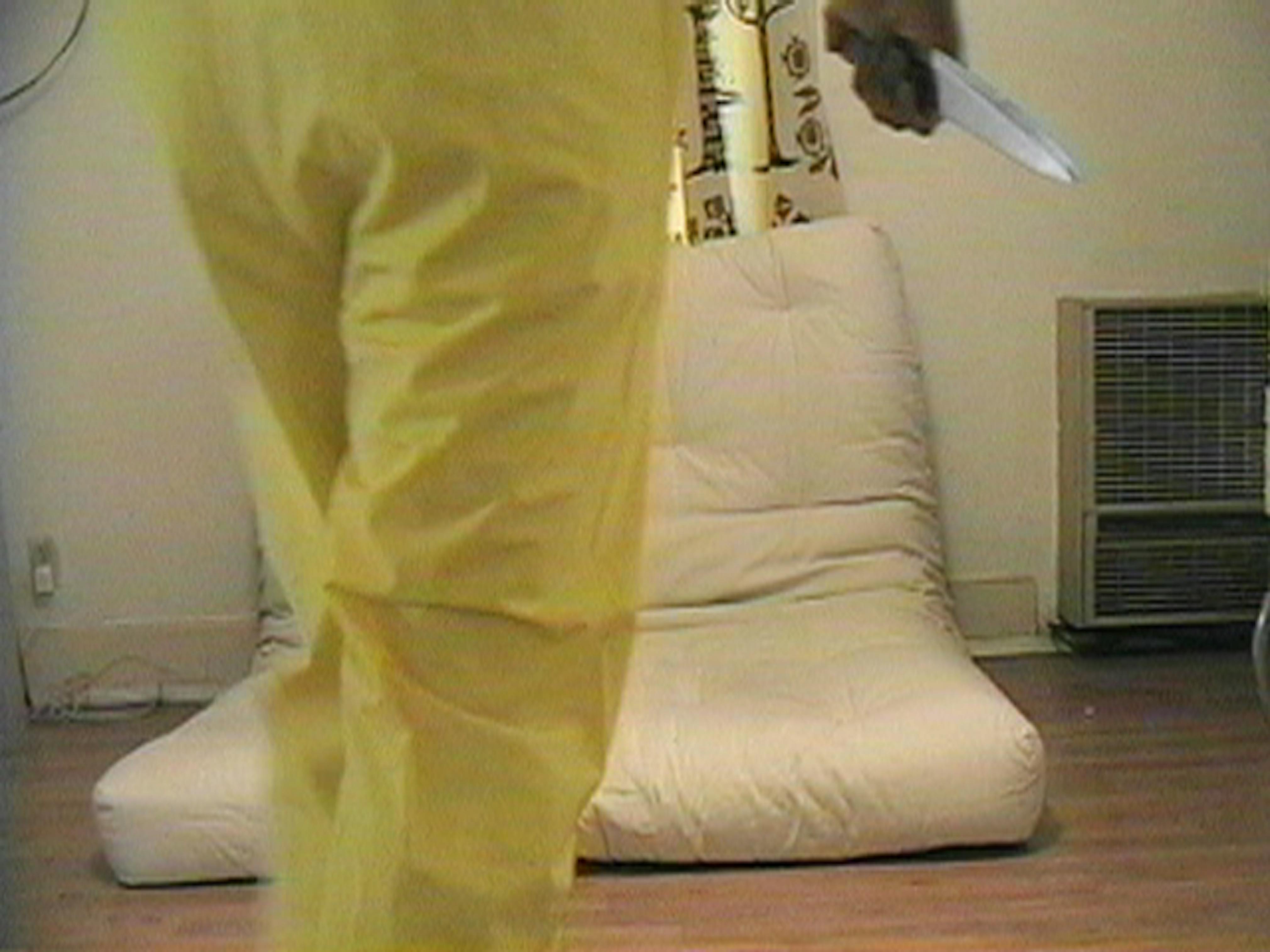 Rodney McMillian’s (b. 1969) Untitled (futon)—shot in one static take, using lo-fi equipment—depicts the artist repeatedly stabbing a futon with a knife, reducing the mattress to a pile of cotton, which he subsequently discards. In the video, McMillian uses performance as a strategy, both acting before a camera to make a recording for an audience, and performing the discrete task of destroying a mattress. Through a simple, repetitive gesture, the artist makes reference to the history of painting, substituting futon and knife-jab for canvas and brushstroke.