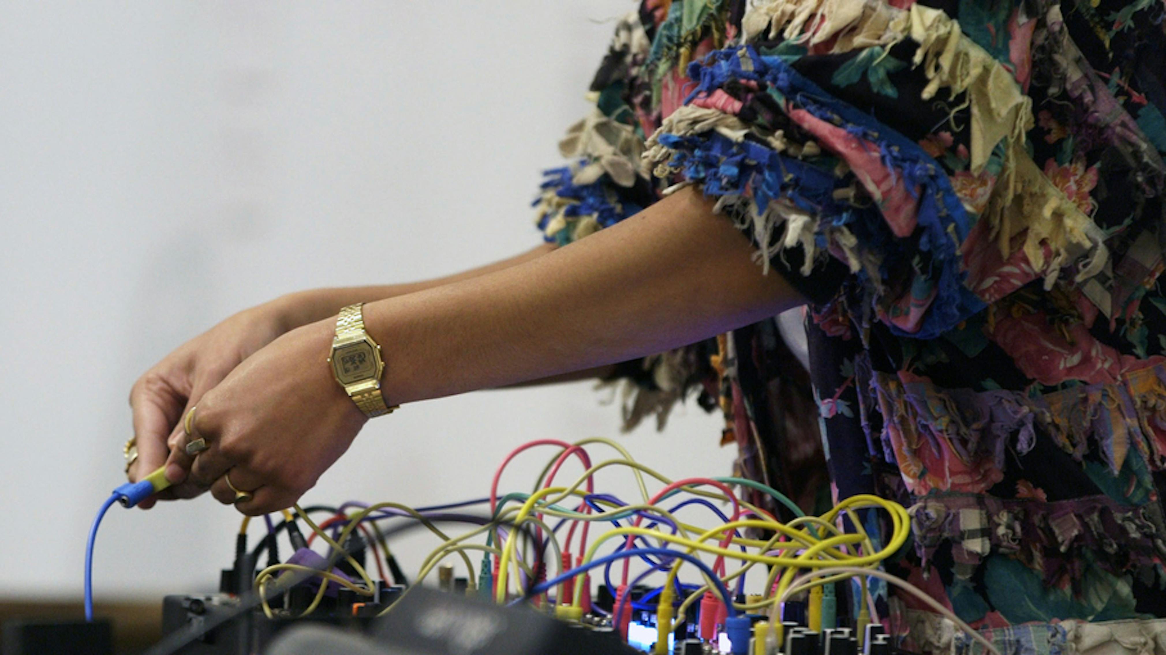 Building on samples from Kanu’s playlist, multidisciplinary artist and creative technologist Ari Melenciano performed a live modular synthesizer set. The word “EXPERIMENT,” in red, on the synthesizer’s cover signaled to audiences the structured spontaneity of her piece. Layering pulsating hums and taps, Melenciano created sharp polyrhythmic patterns that mirrored the industrial textures of Kanu’s practice. Every loop, splice, and sample paralleled Kanu’s remaking of old and discarded materials with stained concrete and found fabrics. As Melenciano turned glowing knobs and fastened neon cables to her instrument, sounds oscillated between a crash and a groove. She maintained a measured approach throughout the performance, moving with a precision that contrasted the aberrant sounds swirling the room.
