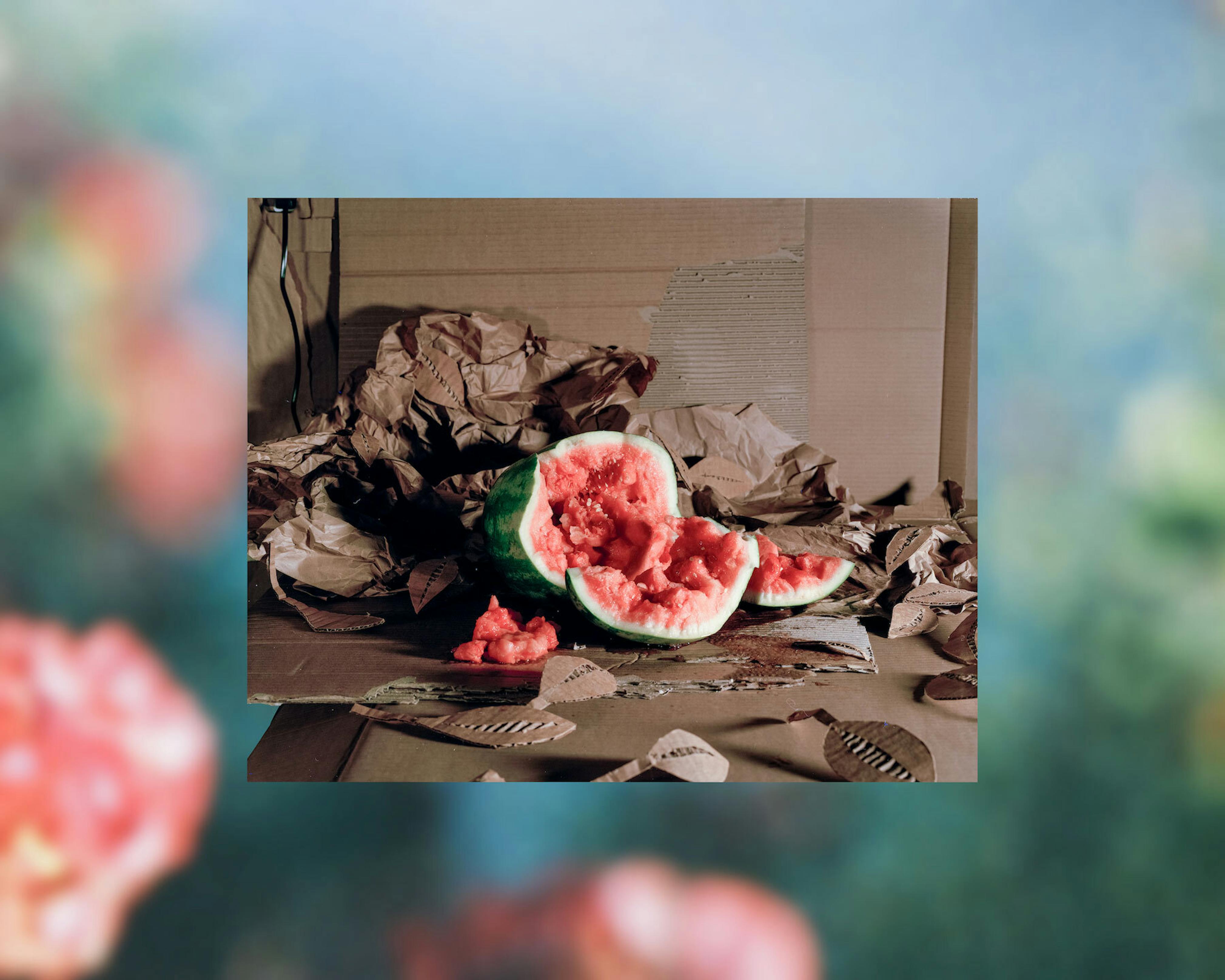 ZJM: I set this up in my garage. I made a backdrop using a wall and a table and staged everything with cardboard and paper. The image of the watermelon is made with a large format film camera. The background image comes from a thirty-five-millimeter negative of a garden with a bunch of flowers; I took that picture when I was in my twenties, one of those things you keep in your back pocket until you find a use for it.