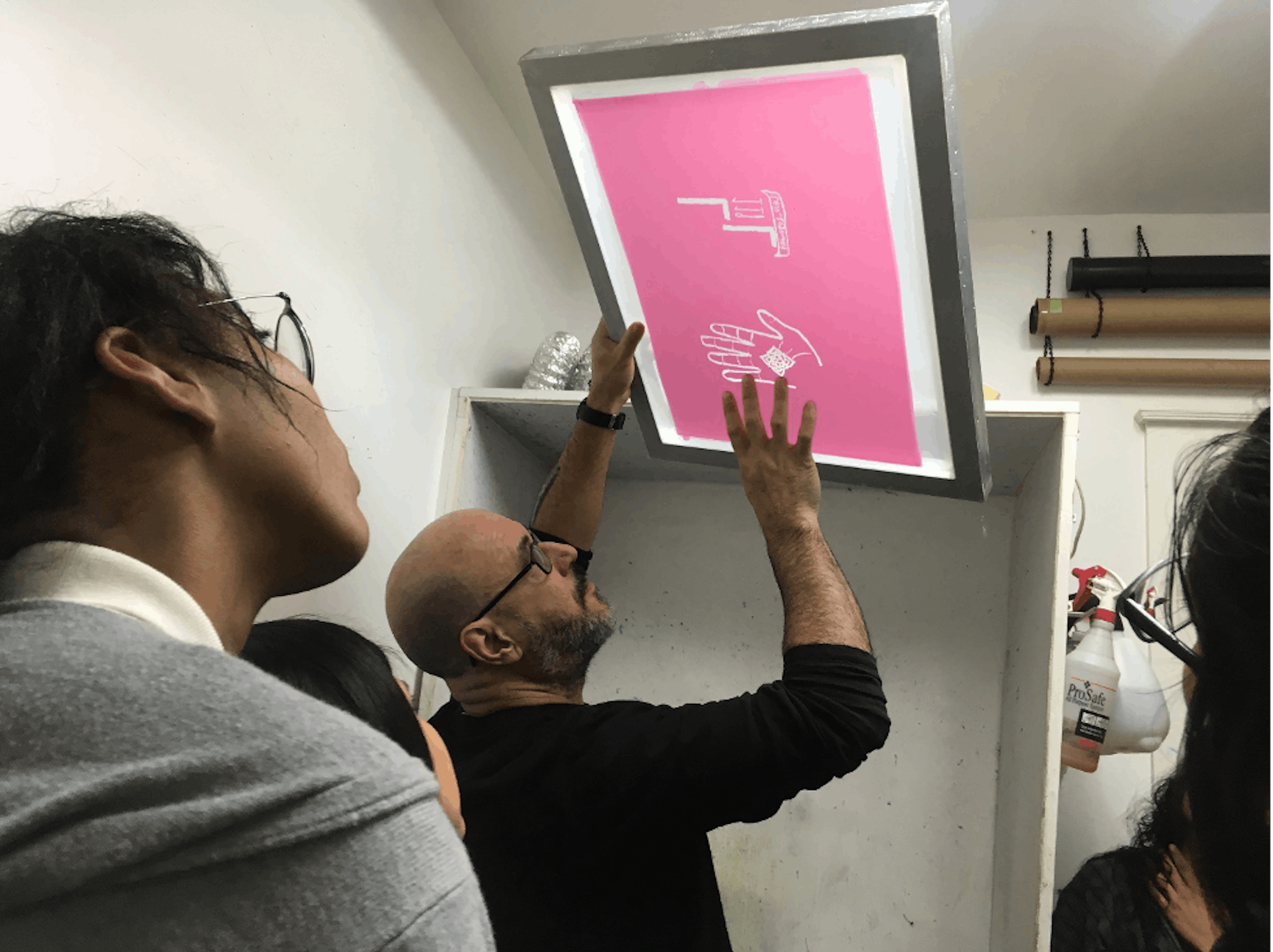 DM: Miguel Luciano. It was so cool that he was able to do the Young Lords tour with us. I also use the Glenn Ligon artwork! With the Studio Museum, we selected, installed, and responded to areplica of I Found My Voice by Glenn Ligon. We talk about the different ways we could find and express our voices. Many students focused on LGBTQIA+ rights, racism, sexism, ageism. We created large banners with the prints and put them in the main lobby where that artwork is. You could see I Found My Voice right next to all of the student prints where they got to make their voices known.