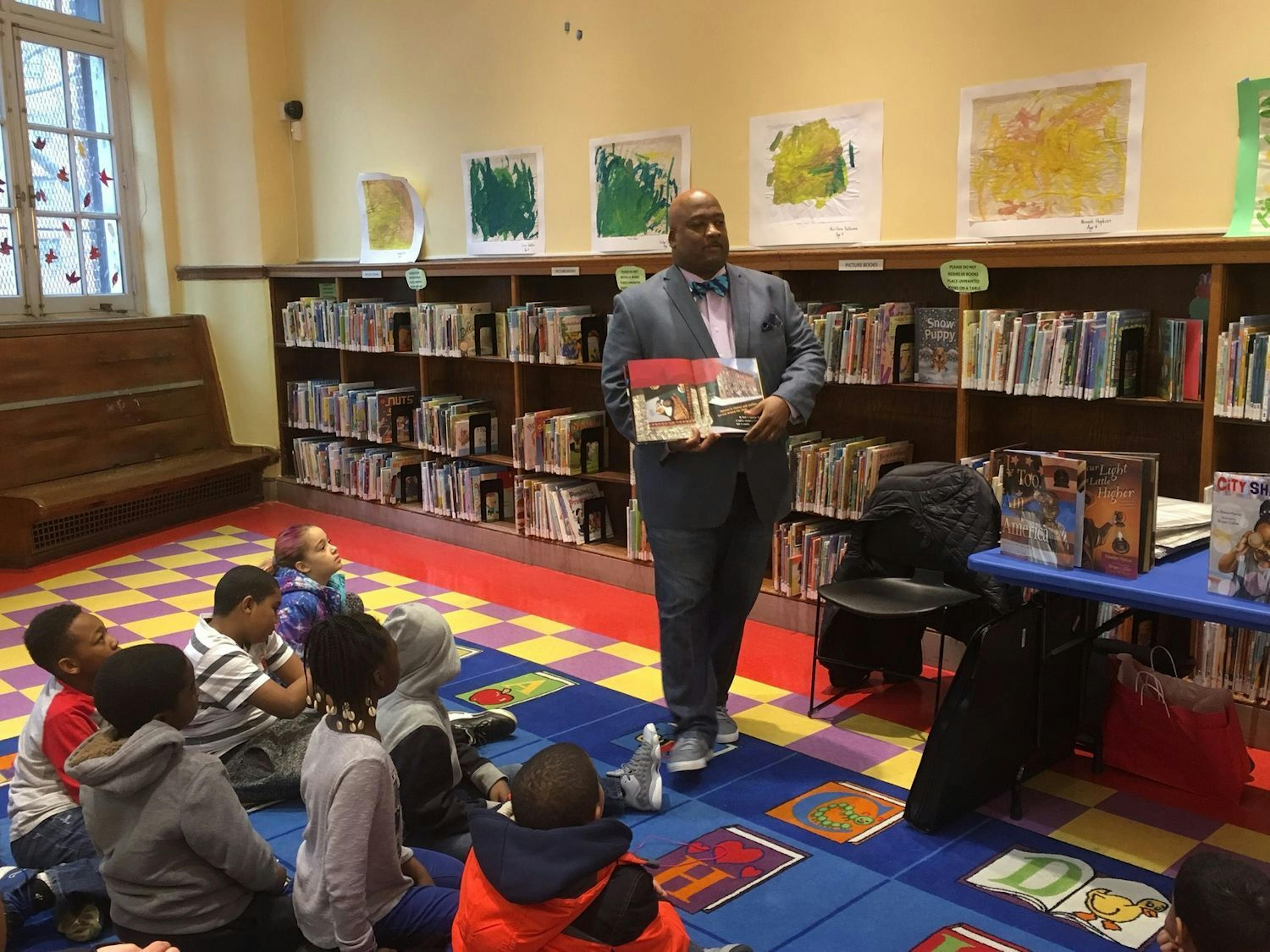 Children's book illustrator Bryan Collier presents an interactive storytelling of his book City Shapes as part of Book, Authors & Kids, a one-hour program that connects story-telling, literacy, and visual art, on July 10, 2016. The program is cited at George Bruce Library as part of inHarlem