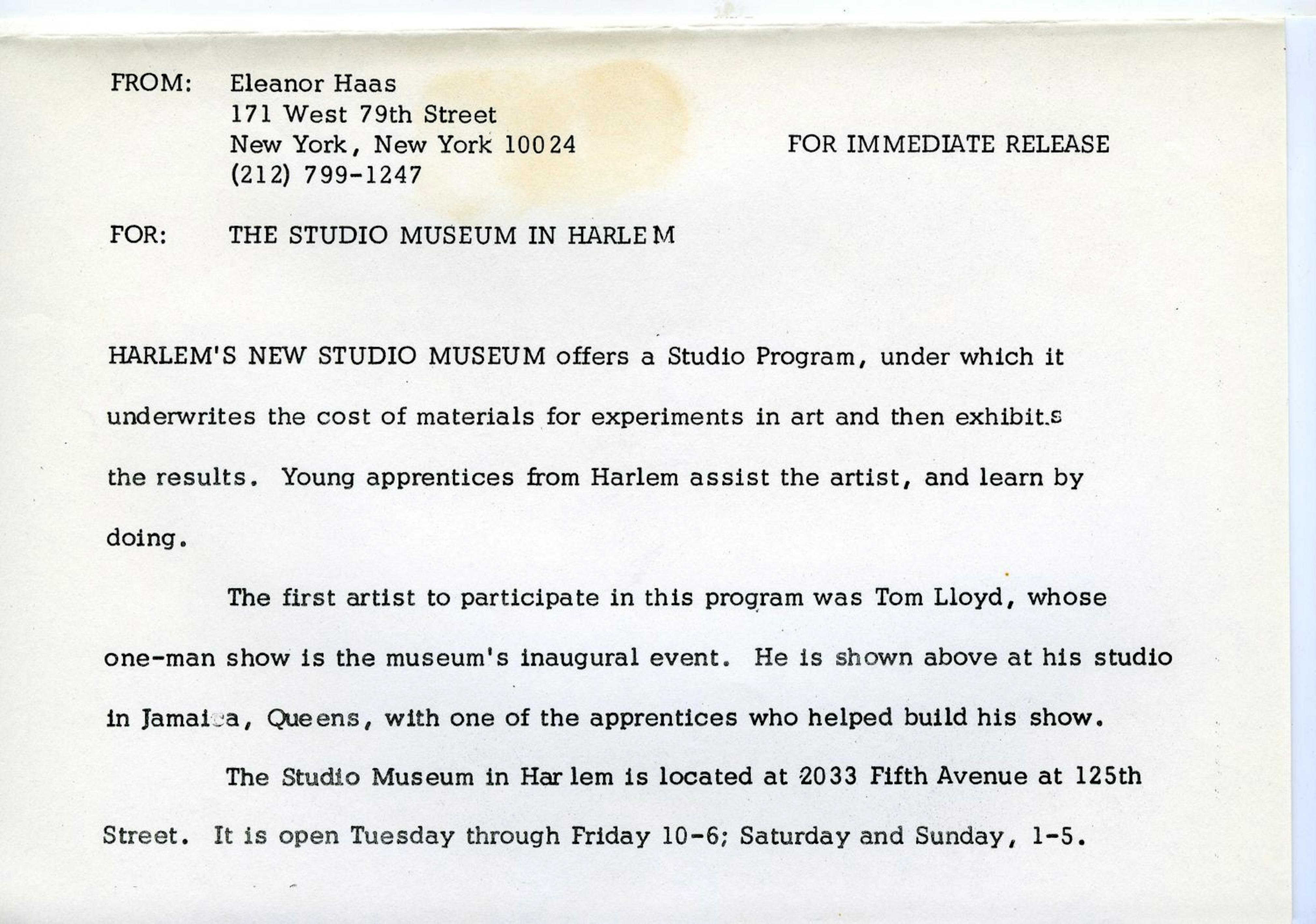 Studio Lab, a program built on the concepts of cultural specificity, performance, and making publics, launches. The series offers selected artists freedom to develop these concepts, including making projects that respond to Harlem as a cultural site.