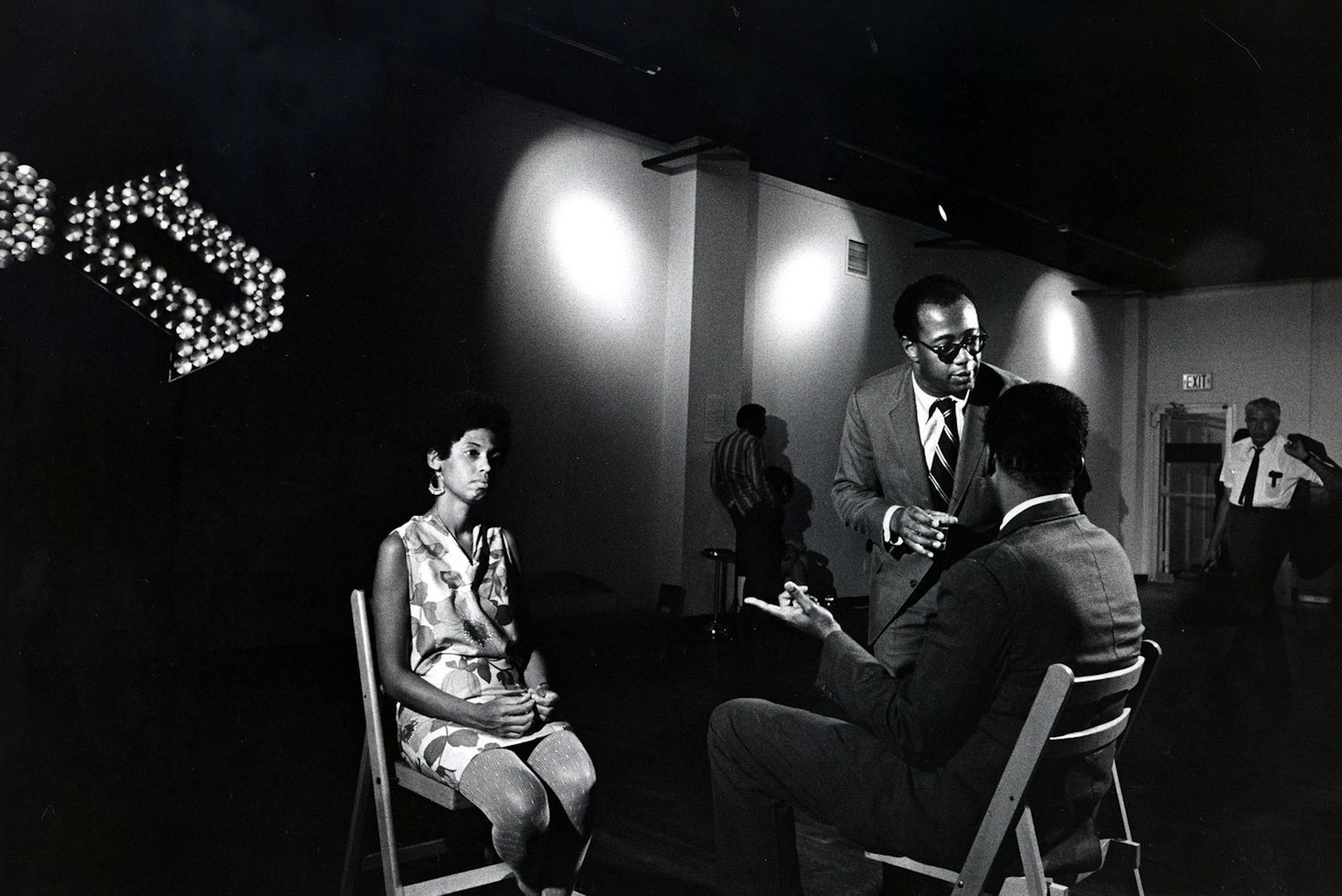 Gil Noble of WABC-TV's "Like It Is" interviews Eleanor Holmes Norton, Studio Museum Trustee, before the opening of Electronic Refractions II in September 1968 at the Studio Museum in Harlem on 2033 5th Avenue