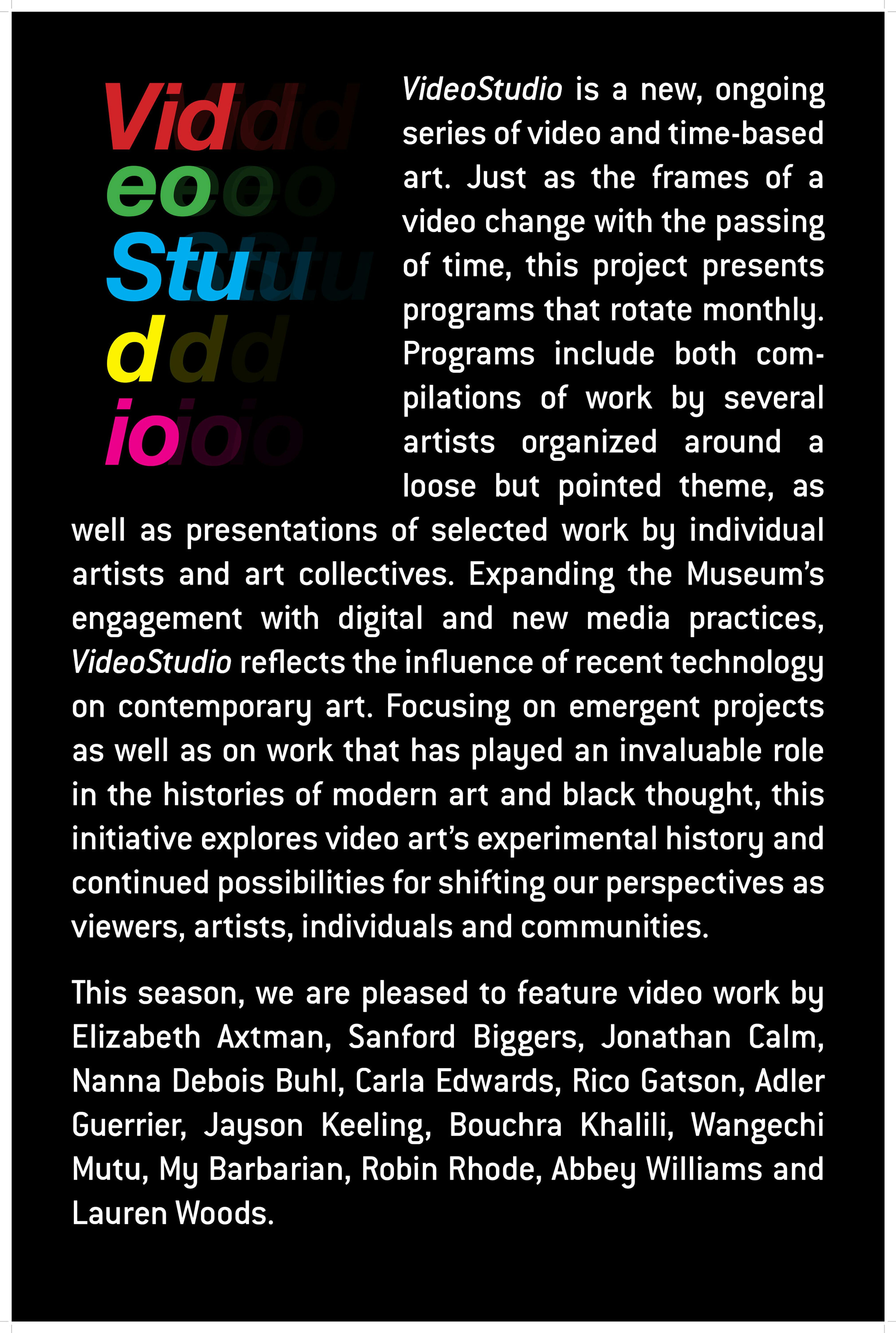 Expanding the Museum’s engagement with digital and new media practices, VideoStudio, a series of video and time-based art, launches. This program focuses on emergent projects and reflects the influence of recent technology on contemporary art.